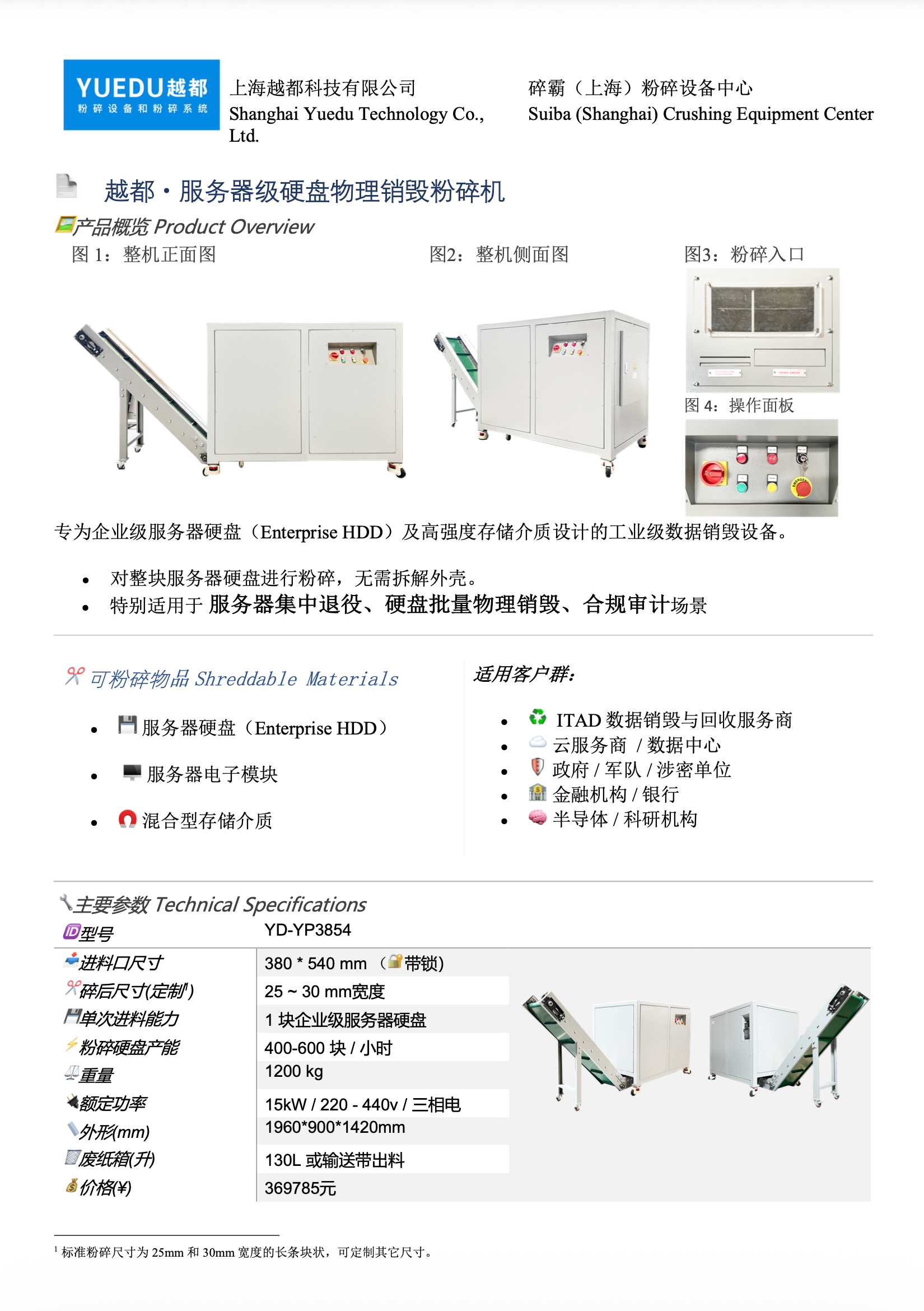 <p>越都 YD-YP3854服务器级硬盘物理销毁粉碎机专为企业级服务器硬盘（Enterprise HDDs）设计产品概述越都...</p>